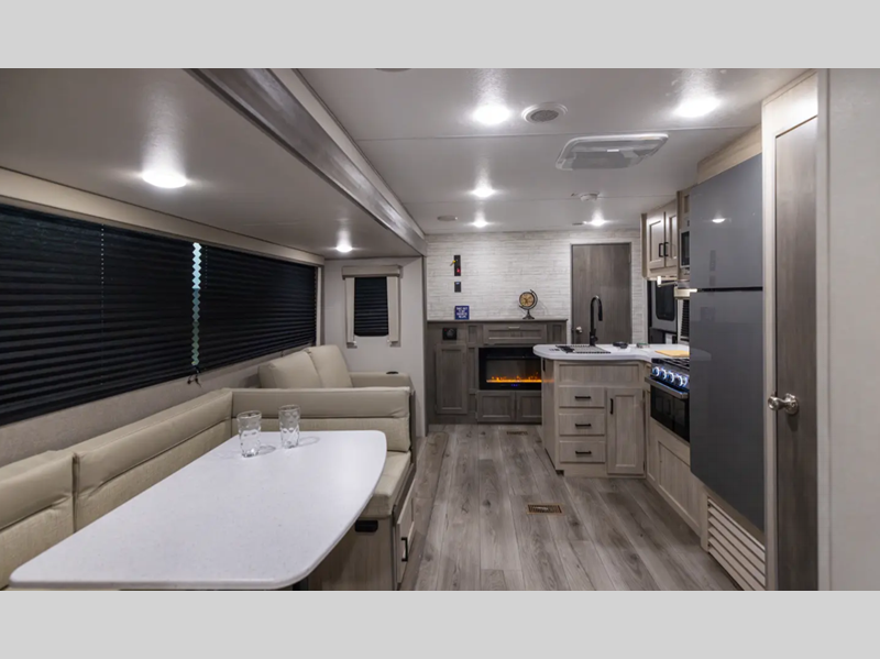 Sleeps 4 Slides 1 Length 28 ft 3 in Ext Width 8 ft Ext Height 11 ft 1 in Int Height 6 ft 9 in Hitch Weight 898 lbs GVWR 7898 lbs Dry Weight 6356 lbs Cargo Capacity 1542 lbs Fresh Water Capacity 38 gals Grey Water Capacity 44 gals Black Water Capacity 29 gals Furnace BTU 35000 btu Available Beds RV Queen Refrigerator Type GE Stainless 12V Refrigerator Size 10.7 cu ft Cooktop Burners 3 Shower Size 34" x 34" Number of Awnings 1 LP Tank Capacity 20 lbs Water Heater Type Tankless On Demand AC BTU 13500 btu Awning Info 18' Electric w/Multicolor LED Strip & Remote Axle Count 2 Number of LP Tanks 2 Shower Type Radius Electrical Service 30 amp Similar Floorplans