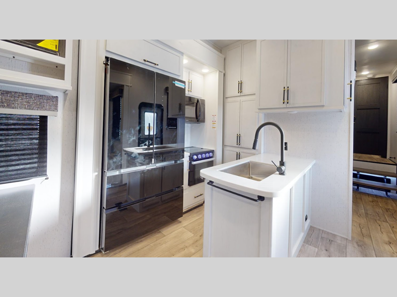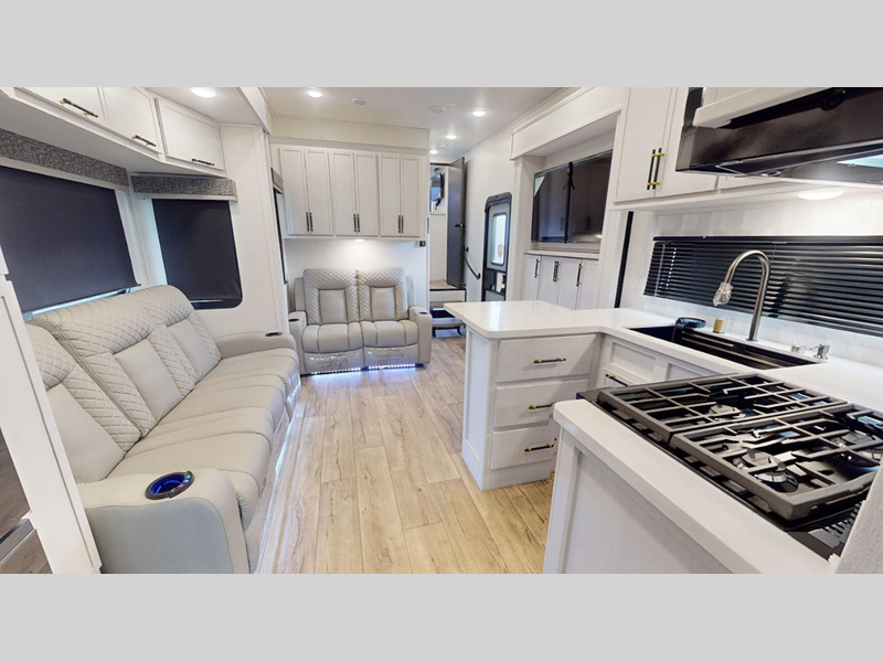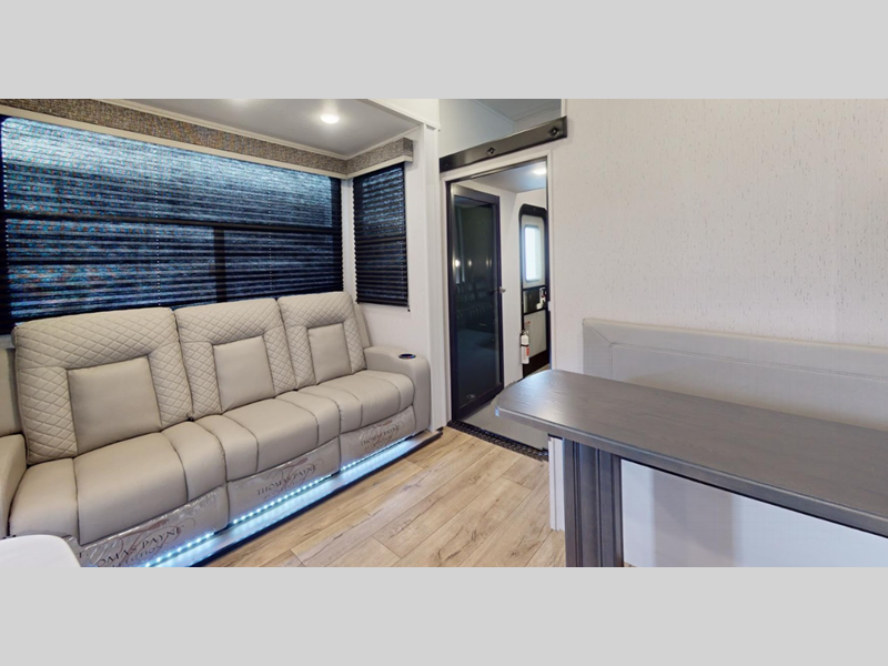 Sleeps 9 Slides 3 Length 44 ft 10 in Ext Height 13 ft 3 in Interior Color Midnight, Platinum Hitch Weight 3070 lbs Dry Weight 15411 lbs Cargo Capacity 4589 lbs Fresh Water Capacity 94 gals Grey Water Capacity 88 gals Black Water Capacity 88 gals Tire Size 16" Fuel Capacity 30 gals Number Of Bunks 1 Available Beds King Refrigerator Type Gas/Electric Refrigerator Size 18 cu ft Cooktop Burners 3 Number of Awnings 1 Axle Weight 7000 lbs Garage Size 13 ft Water Heater Type On demand Tankless TV Info LR 50" TV Awning Info 21' Electric with LED Lights Axle Count 3 Shower Type Walk-In Shower Electrical Service 50 amp Similar Floorplans