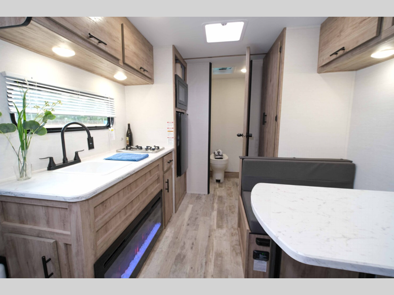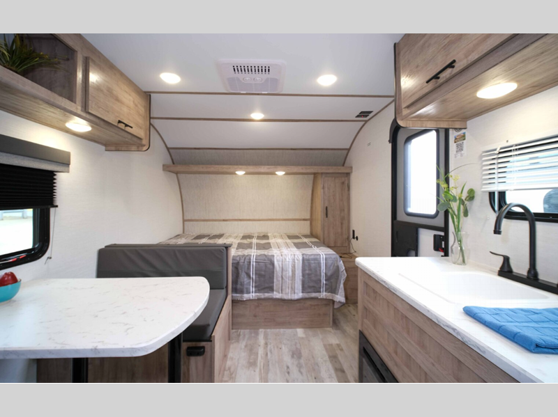 Sleeps 3 Length 20 ft 11 in Ext Width 8 ft Ext Height 10 ft 4 in Int Height 6 ft 8 in Hitch Weight 360 lbs Dry Weight 2920 lbs Cargo Capacity 1080 lbs Fresh Water Capacity 23 gals Grey Water Capacity 36 gals Black Water Capacity 36 gals Cooktop Burners 2 Number of Awnings 1 LP Tank Capacity 20 lbs Water Heater Type Tankless AC BTU 13500 btu Awning Info Power Axle Count 1 Number of LP Tanks 1 Shower Type Tub/Shower Combo Electrical Service 30 amp Similar Floorplans