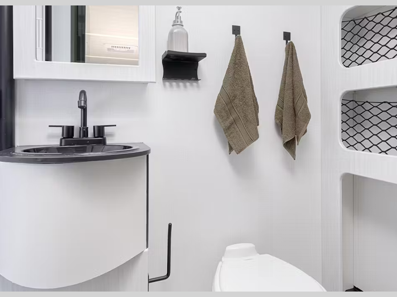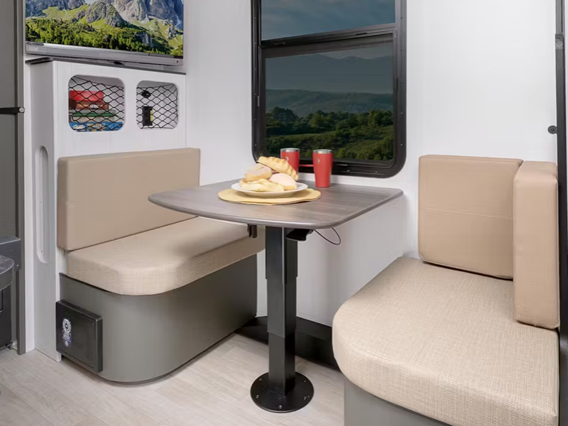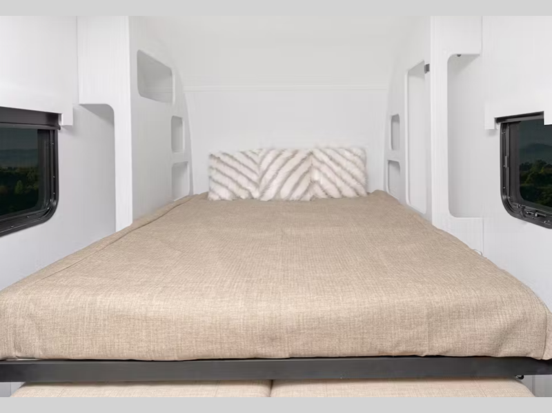The composite build construction and the narrower 7.5 feet wide body provides a durable unit that is easily towable, and the interior is just as inviting with its blackout night shades, solid surface countertops, and ultra bright LED light strip in the kitchen. A power awning will provide added protection outside, and the exterior shower will let you wash off hiking gear.