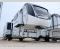 Any cook will love this fifth wheel's layout with a rear kitchen which includes residential appliances, a farmhouse stainless steel sink, a dishwasher, and pantry. You can see the LED TV with a fireplace below from the slide out which includes the sliding table/desk with chairs or from the living area. The theater seating with USB ports, and two hide-a-bed sofa slides widen this area so everyone can stretch out and relax. At night, retire to your own front bedroom with a slide out king electric tilt bed with drawers underneath, a front wardrobe including washer and dryer prep, a closet with a built-in hamper, plus a slide out dresser with a 32" Smart LED TV above it. And the full bathroom provides a residential shower with a seat plus linen storage, and two sinks for more convenience.