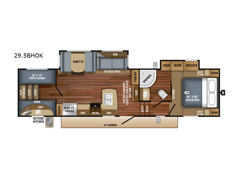 Load up your family of ten and see just how easy each camping trip will be with this double slide out Eagle HT 29.5BHOK fifth wheel. The rear bunkhouse features triple bunks along one side and across the room there is an upper bunk. You will also find a unique set of stair-step storage drawers. In the kitchen there is an 8 cu. ft. refrigerator or you can choose an optional 12 cu. ft. refrigerator if you need more space for your perishable food items. Outside there is an outdoor kitchen with a refrigerator, sink, and pull-out two burner range. Also outside you will enjoy the 19' electric awning with LED lights which provides plenty of shade and maximizes your outdoor living space!